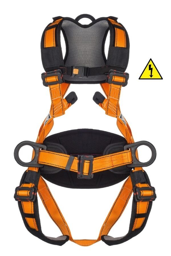 Arnés anticaídas dieléctrico con cinturón de sujeción según normas EN361:2002 y EN358:2018.